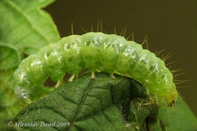 Dorůstá délky 20–25 mm. Hlava je hnědočerná, předohruď a anální štítek jsou hnědožluté. Středem hřbetu prochází typicky tmavý pruh. Každý tergit tělního článku má příčnou řadu 4 větších terčků opatřených štětinou a 2 menších tmavých terčíků. Kukla je mahagonově hnědá, 13–17 mm dlouhá, zakončená čtyřmi háčky na kremasteru.