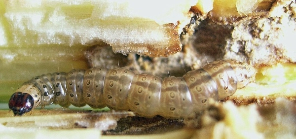 - Housenky vyžírají dřeň lodyh, vřetena kukuřičných palic a zrna v palicích. Ve stéblech a v listenech palic jsou kruhovité otvory po žíru housenek, obvykle se shluky drti a trusu. Při silném poškození stébla dochází k jeho zlomení. Nejprve se lámou laty, později stébla nad nebo pod palicí. Před sklizní jsou na podélném řezu stéblem chodbičky o průměru 3,6–4 mm po žíru housenek, obvykle s housenkou v bazální části stébla.